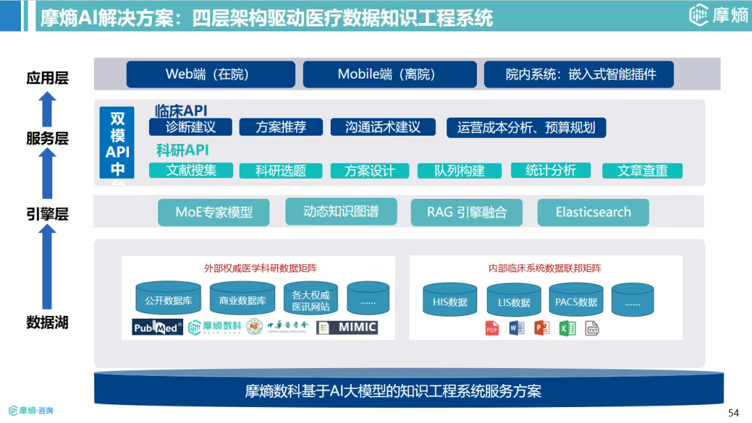 四层智能体系:构建由数据湖、引擎层(向量检索、模型微调)、服务层(API、智能体)、应用层组成的医疗数据知识工程系统。