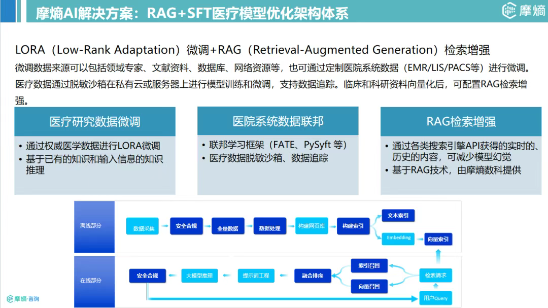 知识精准提炼:将药企内部知识、临床科研文献、定制化医院系统数据(EMR/LIS/PACS等,经脱敏处理)向量化,通过RAG技术实现与问题的精准匹配与增强。