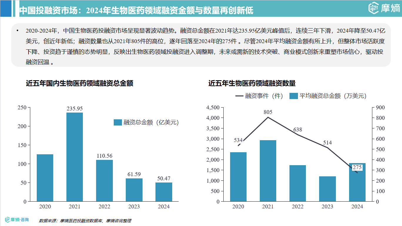 生物医药投融资市场进入调整期:2024年生物医药投融资总额50.47亿美元、融资数量275件,均创近年新低,资本趋于谨慎。与此同时,BD交易总量达228笔,License-out(110笔,占比48%)再创新高,标志着中国药企正加速从技术引入向技术输出转型,全球化合作成为突破资本寒冬的关键路径。