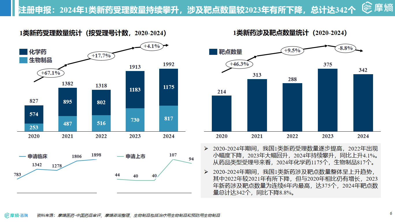 1类新药受理量持续攀升(2024年同比增4.1%),但靶点集中度下降(TOP10占比从27.9%降至16.3%),肿瘤领域以48%的占比成为研发核心,KRAS、HER2、EGFR为前三热门靶点。临床试验总量突破4800项(年复合增长率15%),肿瘤占化学药试验的16.31%、生物药试验的25.06%,GLP-1R靶点热度显著提升(2024年128项试验)。