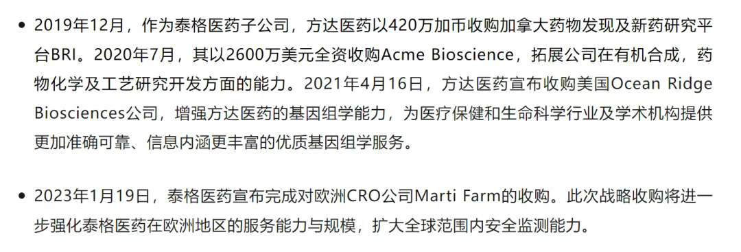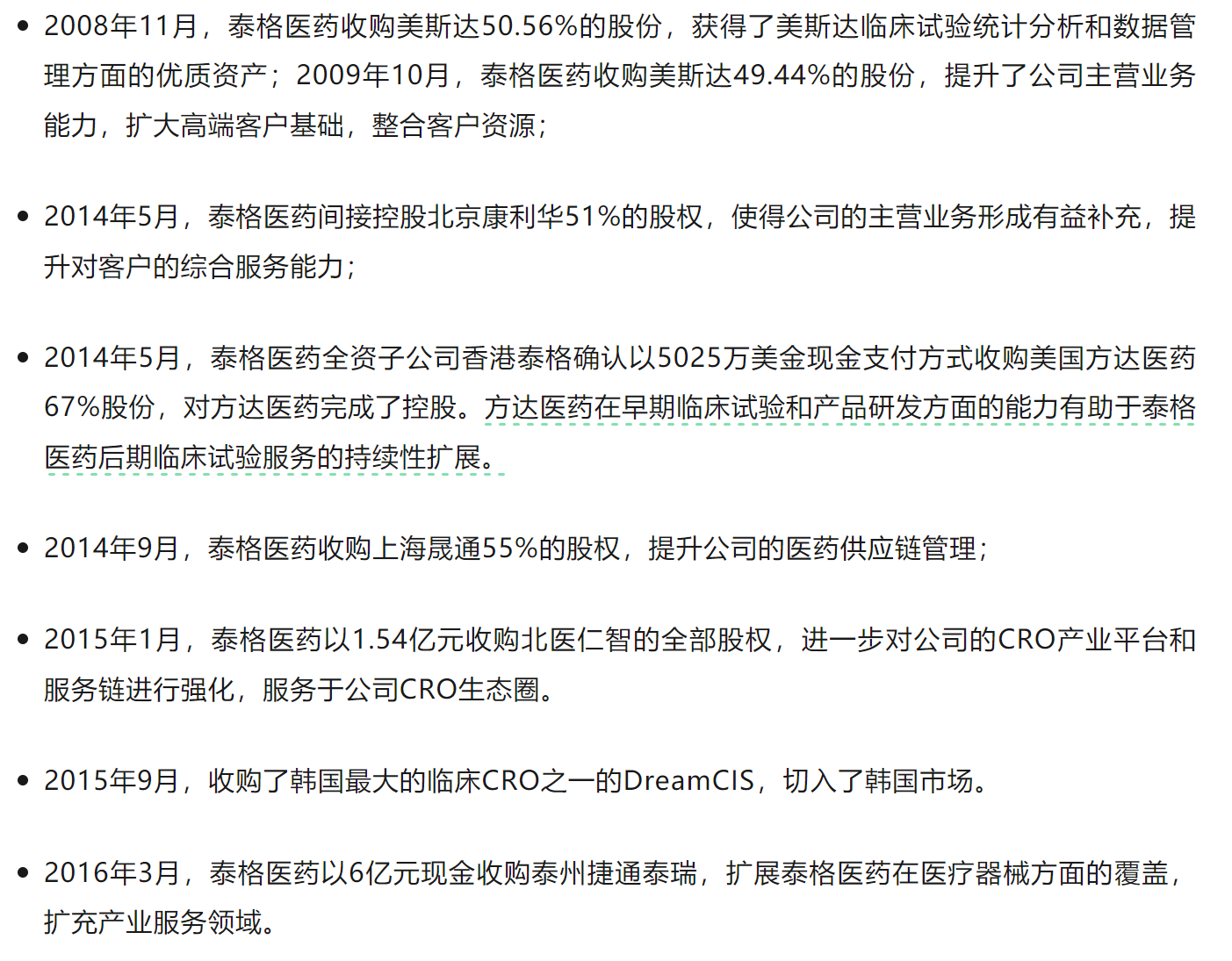 自2008年以来,公司陆续完成了对美斯达、北京康利华、美国方达医药、上海晟通、北医仁智、韩国DreamCIS、加拿大BRI、Acme Bioscience、Ocean Ridge Biosciences以及欧洲Marti Farm等多家CRO或医药研发企业的收购,构建起全球化服务平台。