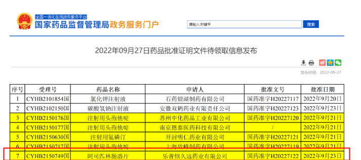NMPA发布2022年09月27日药品批准证明文件待领取信息,共有48个受理号获批,其中5个为一致性评价受理号。