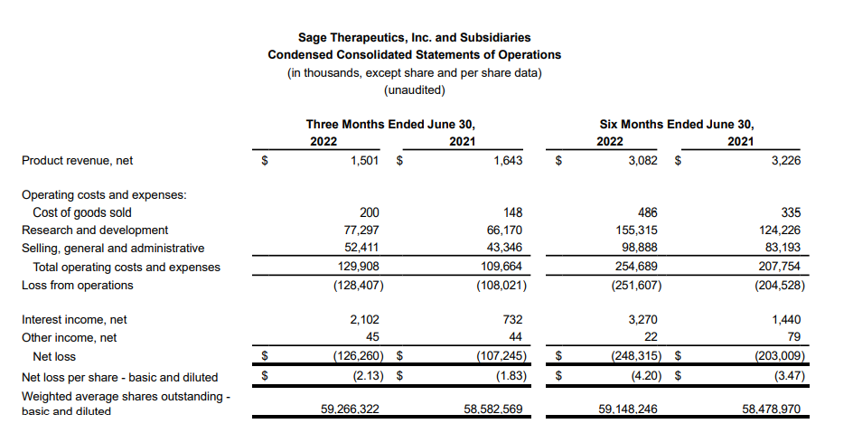2022年8月2日Sage Therapeutics公布2022财年中报,公告显示公司营业收入为308.20万美元,同比下跌4.46%;归属于母公司普通股股东净利润为-2.48亿美元,同比下降22.32%;