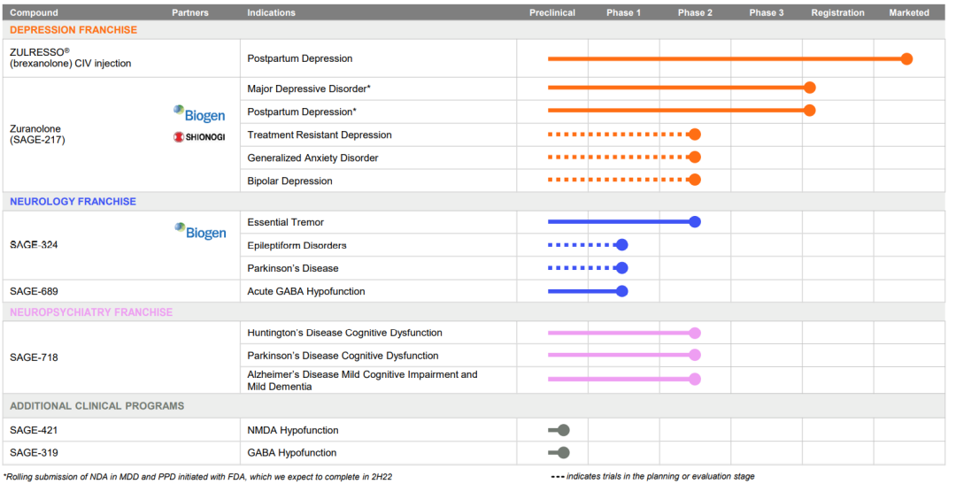 ▲Sage Therapeutics的在研产品线(截至2022年6月30日)