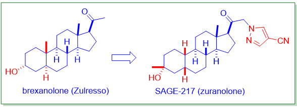 Sage Therapeutics以布瑞诺龙为起点,开发了另一种口服四氢孕酮类似物SAGE-217(zuranolone,译名舒拉诺龙)。从口服生物利用度极低的布瑞诺龙转化为口服的舒拉诺龙的过程,为我们在药物设计上提供了宝贵的经验。在临床试验中,舒拉诺龙对男女抑郁症患者都有效。渤健于2020年11月以高达15.25亿美元的价格购买了舒拉诺龙的权利。