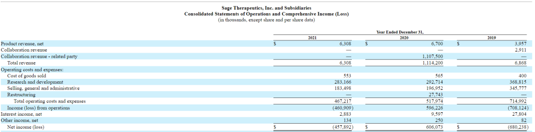 2022年2月24日,Sage Therapeutics发布2021年财报,公告显示公司2021财年营业收入为630.80万美元,同比下跌99.43%。归属于母公司普通股股东净利润为-4.58亿美元,同比下降175.55%;