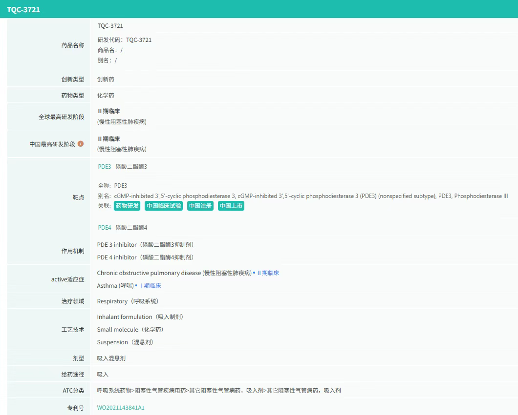 正大天晴的TQC3721混悬液是全球第二款、中国首款进入关键临床阶段的PDE3/4双重抑制剂,通过同时抑制磷酸二酯酶3(PDE3)和磷酸二酯酶4(PDE4),实现了三大核心效应:一是支气管扩张,缓解呼吸困难,改善通气功能;二是抗炎作用,减少肺部炎症,延缓肺功能下降;三是增强黏液清除,改善气道阻塞,降低急性加重风险。