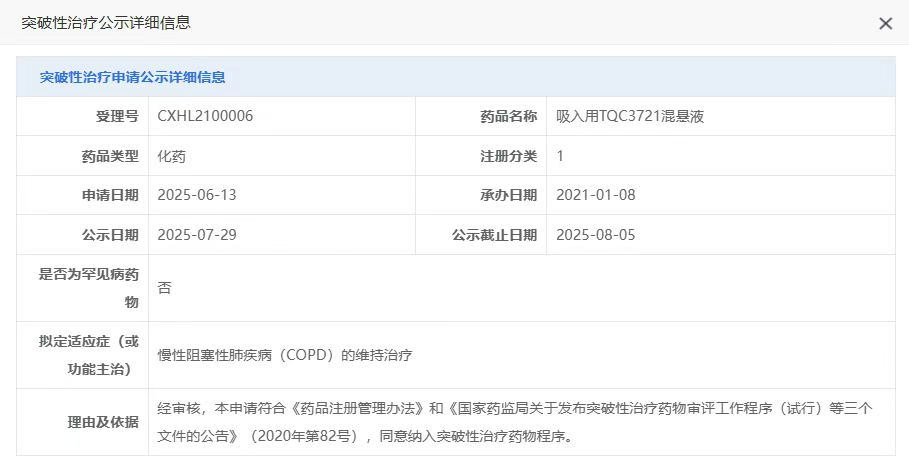 7月29日,国家药品监督管理局药品审评中心(CDE)官网更新显示,正大天晴药业集团自主研发的1类创新药吸入用TQC3721混悬液正式拟纳入突破性治疗品种,用于慢性阻塞性肺疾病(COPD)的维持治疗。