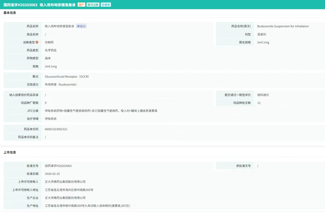 值得一提的是,正大天晴将呼吸领域作为核心战略方向,正通过“仿创结合”模式加速全产业链布局:在技术平台层面,公司重点拓展混悬液、干粉等多剂型吸入制剂的研发与生产,构建覆盖全年龄段患者、适配复杂病情的差异化技术体系;在创新管线布局上,围绕PDE3/4、P2X3、ROCK2、TSLP等前沿靶点展开深度研发,形成针对COPD、哮喘、特发性肺纤维化(IPF)等重大未满足临床需求的创新产品矩阵;已上市产品矩阵中,吸入用布地奈德混悬液、噻托溴铵粉雾剂等核心品种持续保持着市场领先地位,其中吸入用布地奈德混悬液(商品名:天晴速畅)作为国内呼吸领域的重要突破,自2020年2月获批上市以来,迅速打破了阿斯利康原研药在中国市场长达20年的垄断格局。