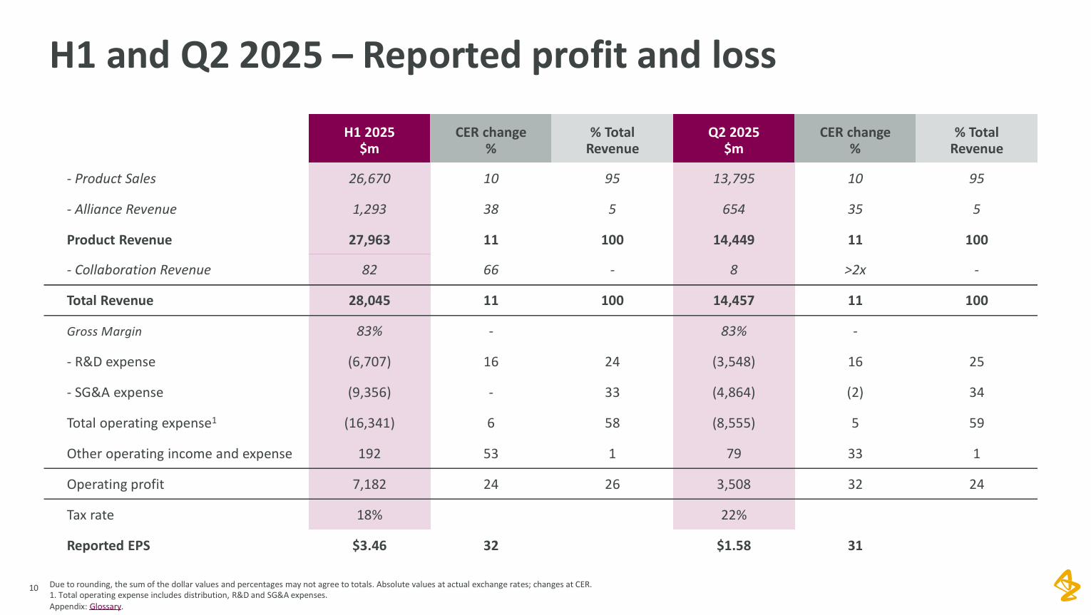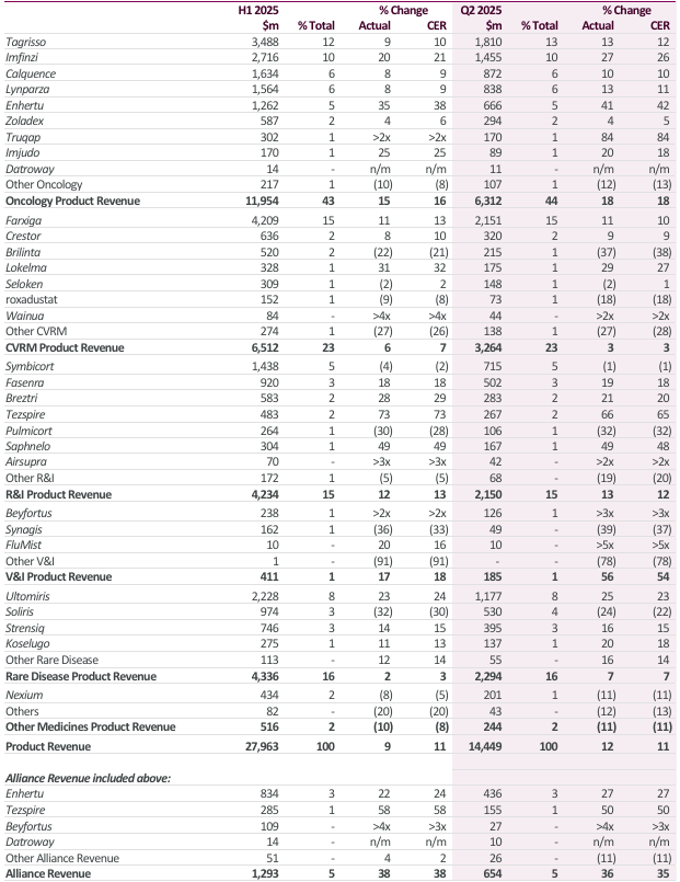 2025年7月29日,阿斯利康公布2025年H1业绩,上半年总营收280.45亿美元(+11%),其中产品收入279.63亿美元(+11%);研发投入67.07亿美元,同比增长16%。