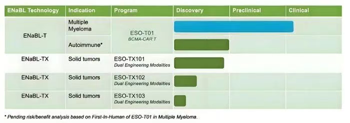 EsoBiotec 主打体内细胞疗法,核心为 ENaBL 平台——用高靶向慢病毒把基因指令直接送进特定免疫细胞,兼顾肿瘤与免疫疾病。其头牌产品 ESO-T01,通过体内重编程 T 细胞去攻击 BCMA,用于多发性骨髓瘤。最新 I 期数据:4 例患者全部响应,其中 2 例完全缓解;不良反应以 CRS 及血液毒性为主。