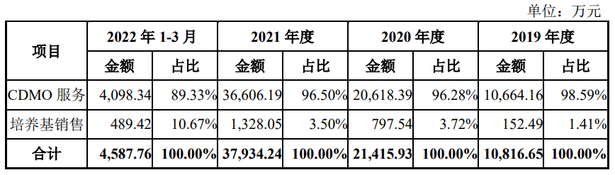 2020和2021财年,迈百瑞营业收入(涵盖CDMO和培养基)分别为2.17亿元、3.88亿元,净利润-409.49万元、5956.14万元。2022年1-3月份,实现营业收入4681.42万元,净利润177.72万元。