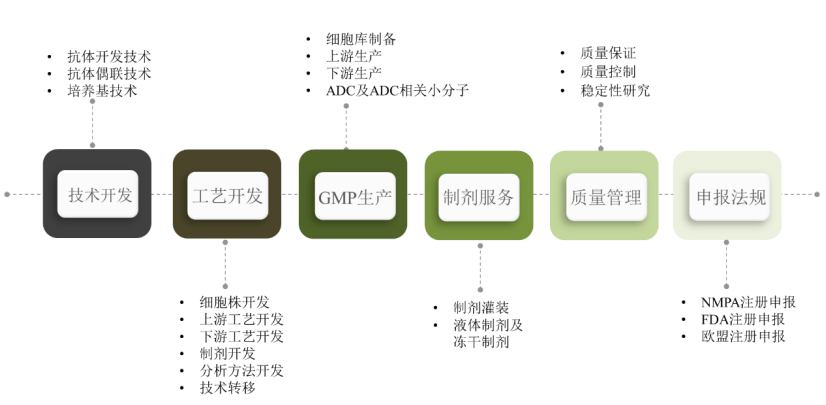 迈百瑞是一家聚焦于生物药领域的CDMO企业,拥有烟台、上海、圣地亚哥三个研发及生产中心,可以为全球客户提供单抗、双抗、多抗、融合蛋白、ADC等创新生物药、生物类似药的早期研发、工艺开发、临床样品生产、商业化生产等全链条、定制化服务。是目前全球少数具备提供抗体偶联药物全链条CDMO服务的公司之一。