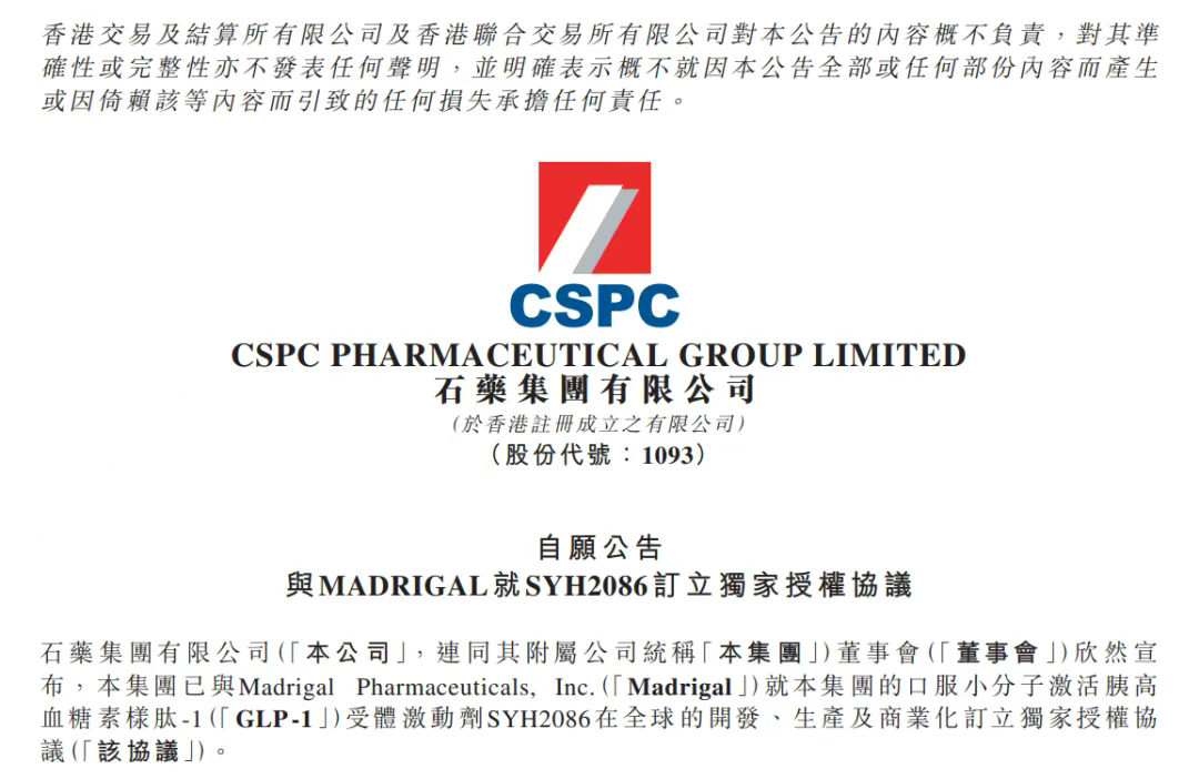 2025年7月30日,石药集团宣布已与Madrigal Pharmaceuticals就其口服GLP-1受体激动剂SYH2086在全球的开发、生产及商业化订立独家授权协议。