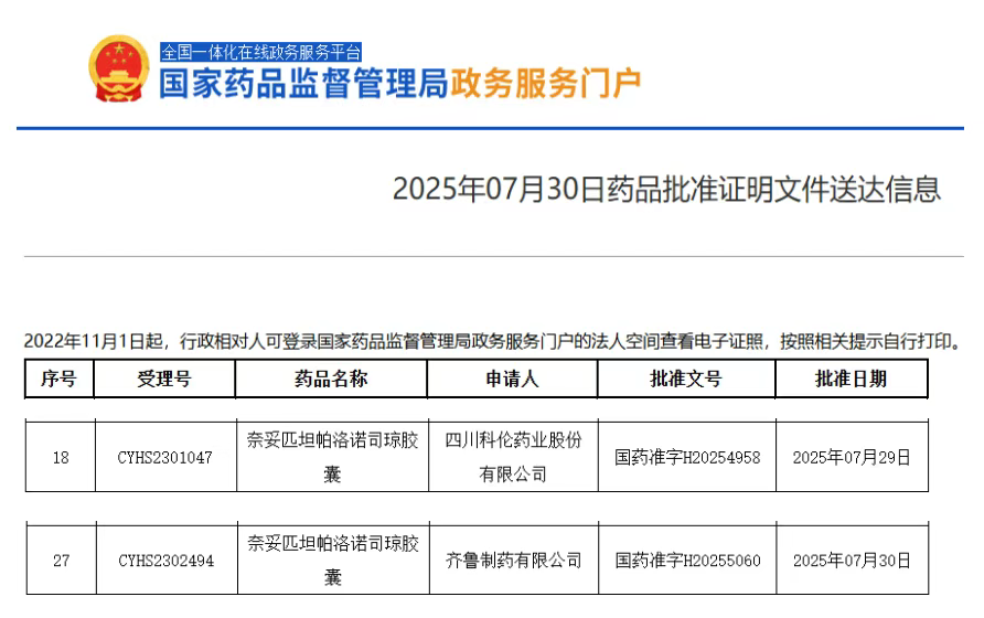7月30日,国家药监局(NMPA)官网显示,四川科伦药业股份有限公司按仿制4类申报的奈妥匹坦帕洛诺司琼胶囊获批上市,视同通过一致性评价,一举拿下该复方止吐药首仿,齐鲁制药也随后获批。