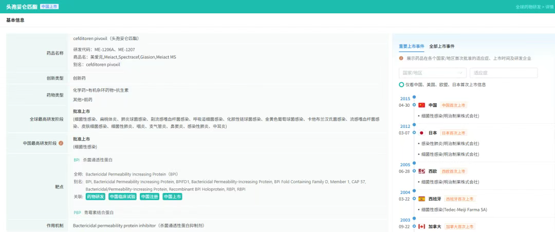 头孢托仑匹酯是由日本明治制果与TAP公司联合开发的第三代头孢类抗菌药,堪称抗菌界的“明星选手”,1994年首先以片剂形式在日本上市(商品名:Meiact MS),2001年进入美国市场,2005年获欧盟批准,目前已在全球27个国家上市。其颗粒剂型于1998年在日本获批,2009年扩展至成人吞咽障碍患者使用。作为针对敏感菌感染的广谱抗生素,该产品适用于浅表性皮肤感染、肺炎、中耳炎、鼻窦炎、膀胱炎等多种适应症,通过抑制细菌细胞壁合成发挥抗菌作用,对葡萄球菌属、链球菌属、肺炎链球菌等常见病原菌具有强效活性,尤其对耐药菌株(如青霉素耐药肺炎链球菌)表现出显著优势。