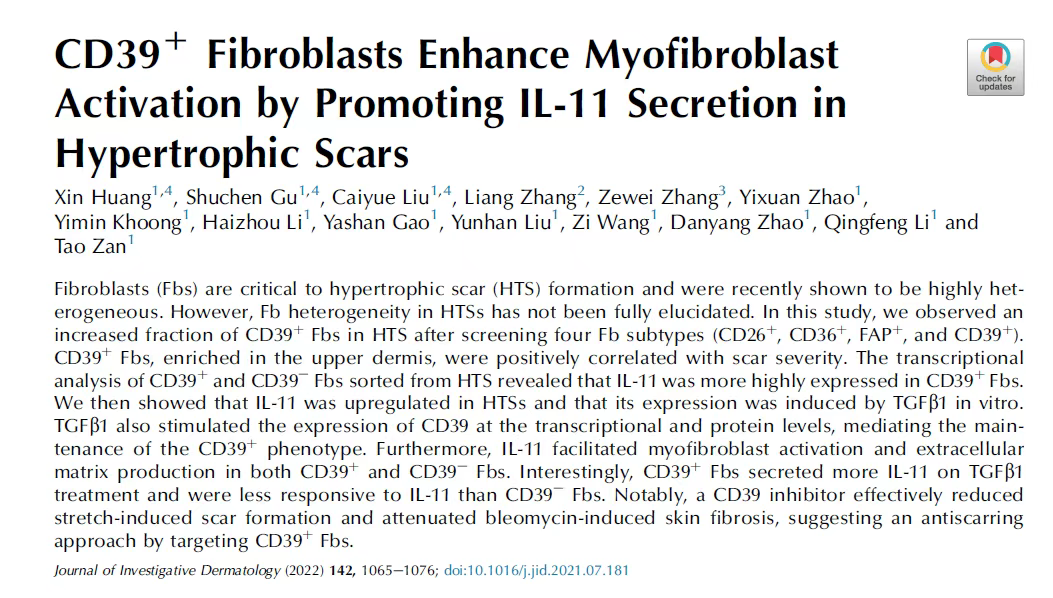 2021年,上海第九人民医院整复外科主任李青峰教授团队在《Journal of Investigative Dermatology》发表的重要研究发现,CD39+成纤维细胞作为增生性瘢痕形成的主要效应细胞,其IL-11表达水平与瘢痕严重程度呈显著正相关,且IL-11是该细胞亚群中上调幅度最大的细胞因子(较正常组织提升5-8倍)。这项研究首次证实了IL-11信号通路在瘢痕增生中的关键调控作用,不仅拓展了对IL-11生物学功能的认知,更通过揭示CD39+成纤维细胞-IL-11轴在病理性瘢痕形成中的核心地位,为靶向IL-11的瘢痕治疗提供了直接理论依据,提示抗IL-11疗法可能成为改善病理性瘢痕的新策略。目前基于这一发现,研究团队正在开展相关转化研究以验证IL-11靶向药物在瘢痕治疗中的实际效果,这为9MW3811等IL-11抑制剂在整形修复领域的应用开辟了新的治疗方向。