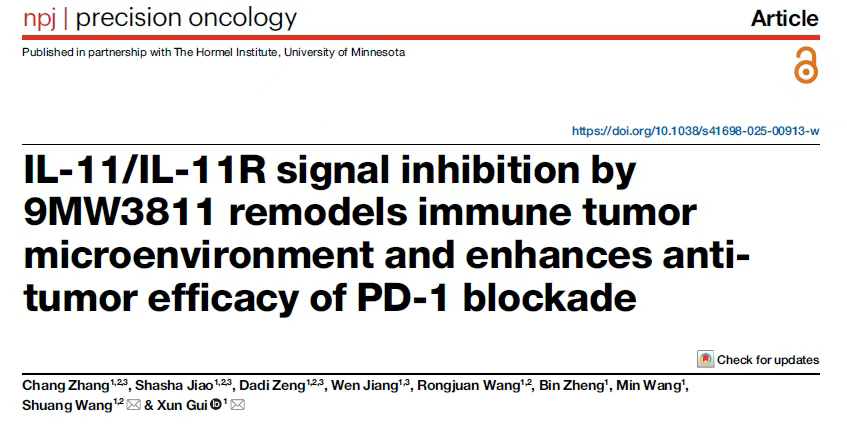从机制研究方面,9MW3811 通过特异性结合 IL-11,高效阻断 IL-11/IL-11Ra/gp130 三体复合物形成,进而抑制下游信号通路的激活。文章还特别指出,当9MW3811与抗 PD-1 抗体联用时,能够显著促进 CD8+T 淋巴细胞的浸润,改善抗 PD-1 抗体引起的 T 细胞耗竭状态,并上调杀伤性细胞因子的分泌,从而表现出更好的联合抗肿瘤药效。