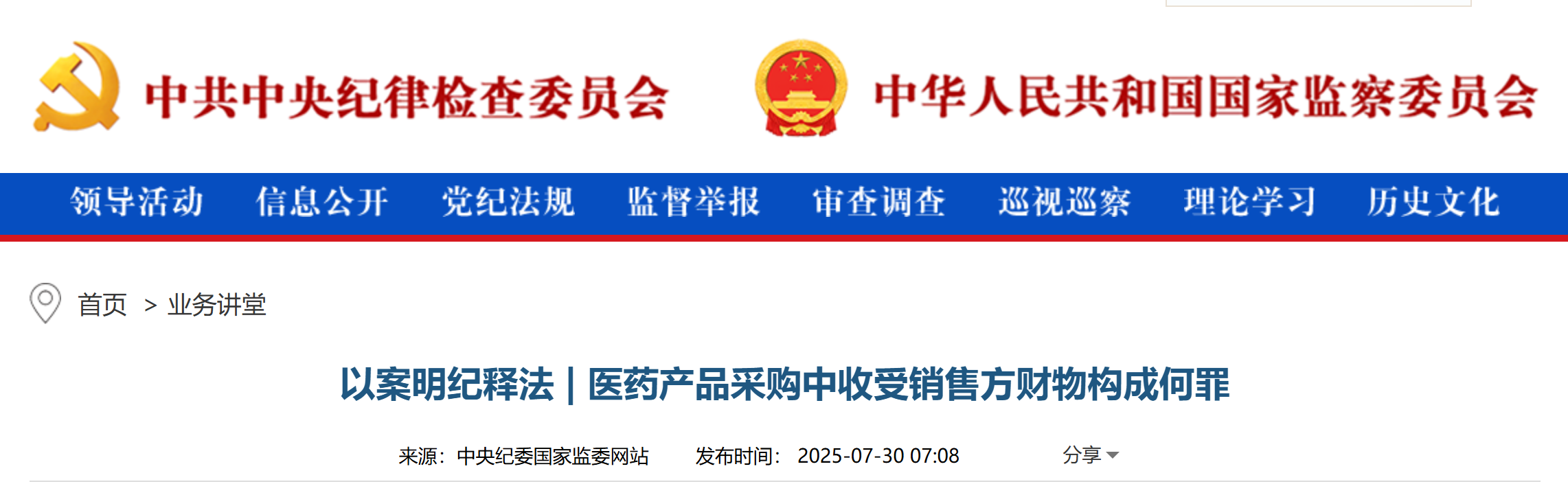 7月30日,中纪委网站发布《以案明纪释法 | 医药产品采购中收受销售方财物构成何罪》一文,剑指医药购销领域顽疾,某市骨科主任张某某收受耗材销售方287万元财物,为特定品牌“开绿灯”,最终被以受贿罪重判!