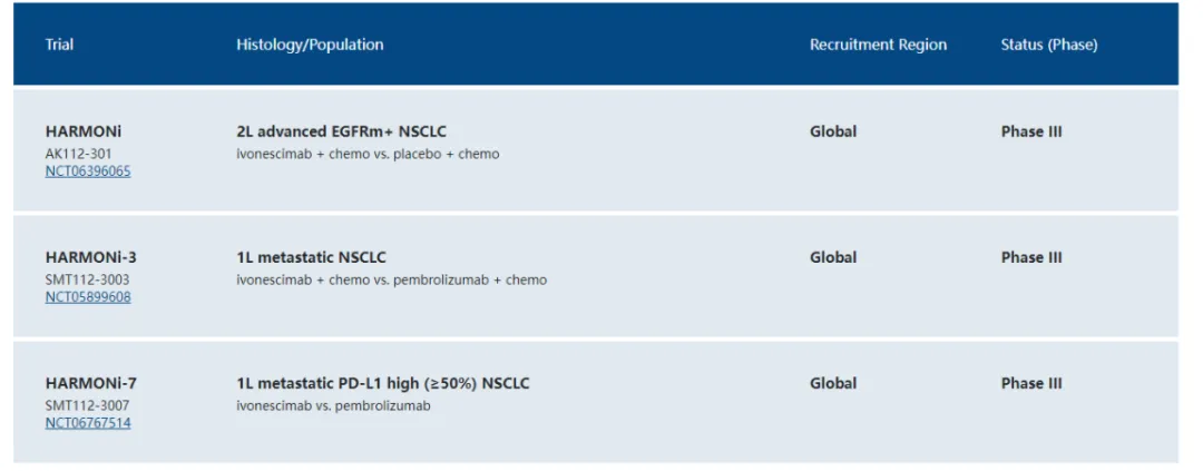 目前,Summit Therapeutics已在全球推进三项III期临床试验,涵盖多个非小细胞肺癌(NSCLC)适应症,包括二线晚期EGFR突变阳性非小细胞肺癌、一线转移性非小细胞肺癌、一线转移性PD-L1高表达(≥50%)非小细胞肺癌。