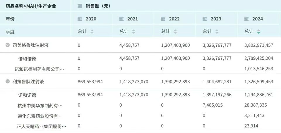 GLP-1产品的销售成绩(来源:摩熵医药数据库)