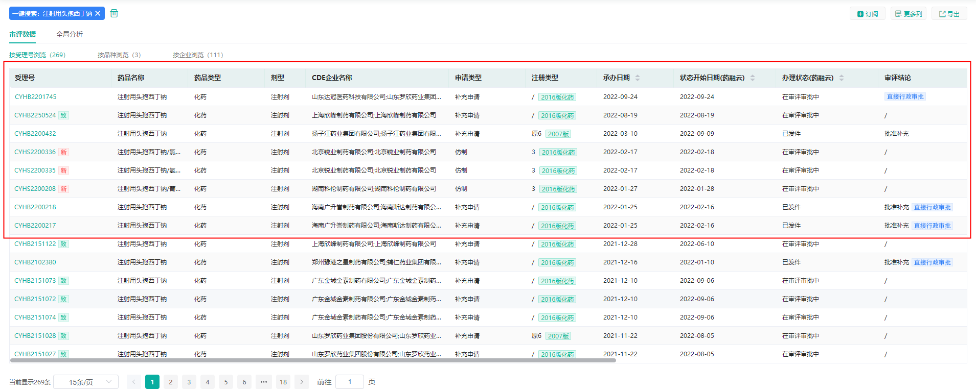 注射用头孢西丁钠申报情况(标红框内为2022年的,点击查看更多年度数据)