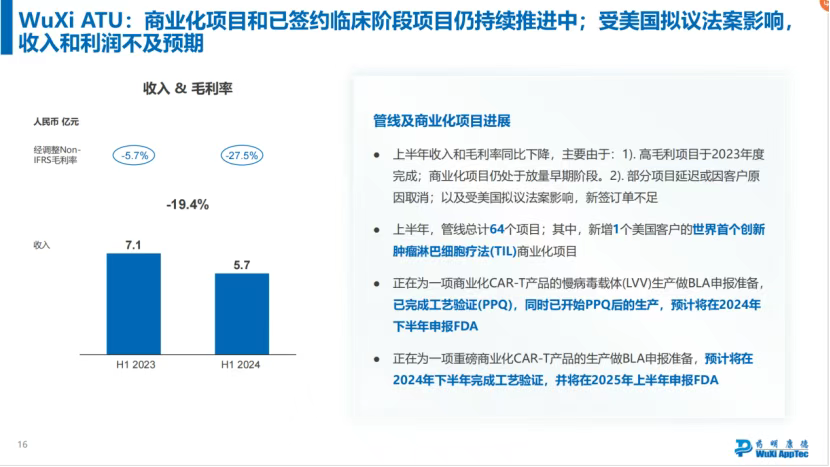 药明生基/WuXi ATU,曾经是药明康德的高端治疗CTDMO业务。2020年—2023年及2024年前3季度,高端治疗CTDMO业务收入分别为10.56亿元、10.26亿元、13.08亿元、13.10亿元和8.5亿元人民币。2021-2023年毛利润分别为-0.21亿元、-0.87亿元、-1.3亿元人民币。