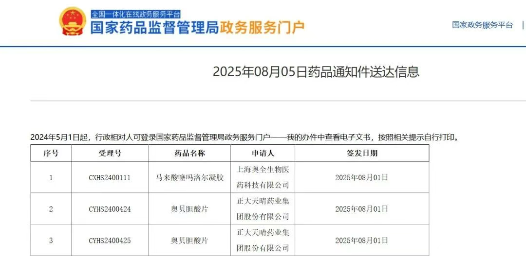 8月5日,NMPA发布了一批通知件,正大天晴的奥贝胆酸片赫然在列。