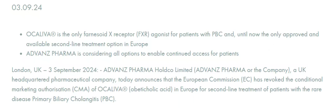 2024年9月3日,Advanz宣布欧洲委员会(EC)已撤销奥贝胆酸在欧洲的附条件上市许可。