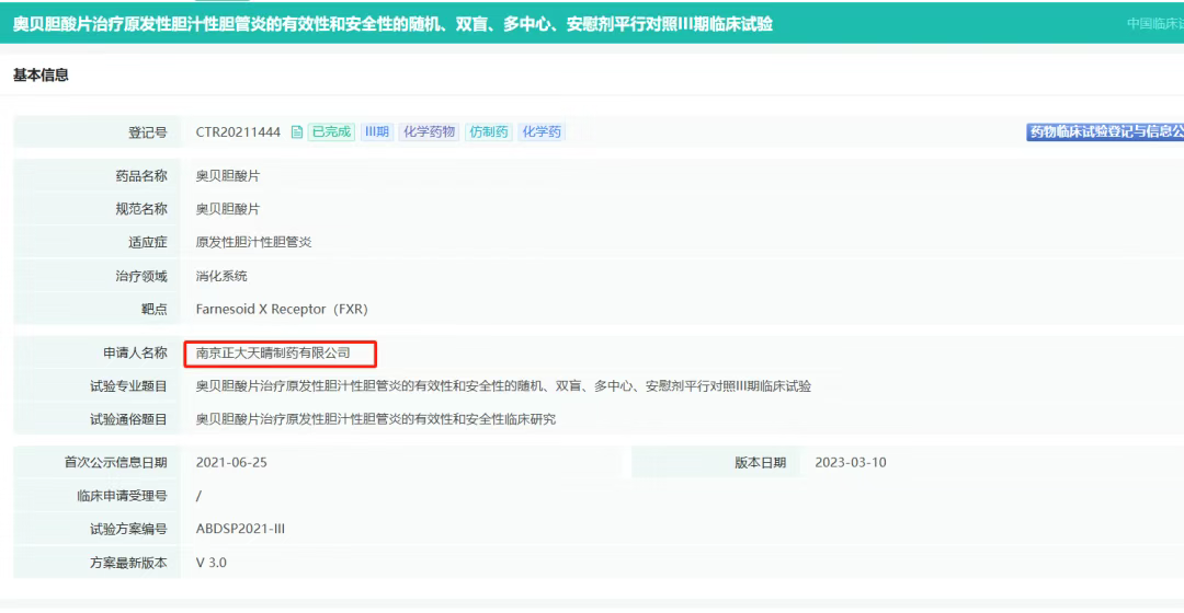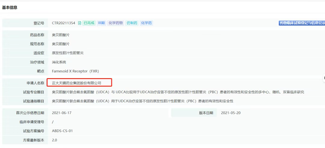 另一次是奥贝胆酸片在胆管炎中的有效性和安全性,申请人是南京正大天晴,该持有人的上市申请尚在审批中。