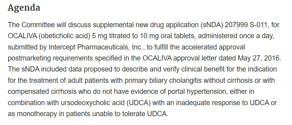 与此同时,奥贝胆酸在美国一样备受质疑。2024年9月13日,美国FDA召开专家咨询委员会讨论由Intercept提交的补充新药申请(sNDA)207999 S-011,讨论临床获益问题,最终以13:1的压倒性投票结果否决了奥贝胆酸的补充新药申请。