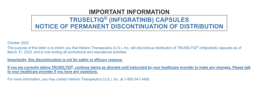 2022年10月,Helsinn Group基于商业计划考量,宣布撤回infigratinib在美上市申请;计划于2023年3月31日停止供应。要知道,Helsinn Group仅在7个月前获得本品在美国肿瘤适应症权益(扩大了于2021年3月的合作计划)。