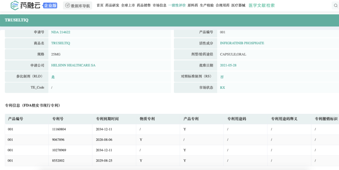 Infigratinib/英菲格拉替尼相关专利:WO-2006000420。本品最早由Novartis (诺华)开发,发明人包括多位华人科学家;相关合作伙伴包括QED Therapeutics/BridgeBio Pharma(2018年开展合作)、Helsinn Group(瑞士赫尔森)、联拓生物等等。目前获批上市的国家有美国、加拿大、澳大利亚。