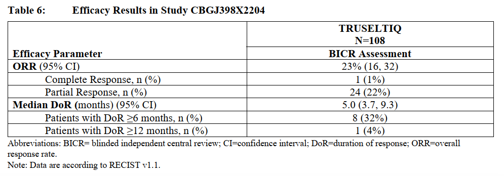 TRUSELTIQ™靶向FGFR蛋白,阻断下游活性。在临床研究中,TRUSELTIQ™ 显示出具有临床意义的肿瘤缩小率(总体缓解率约23%)和缓解持续时间。