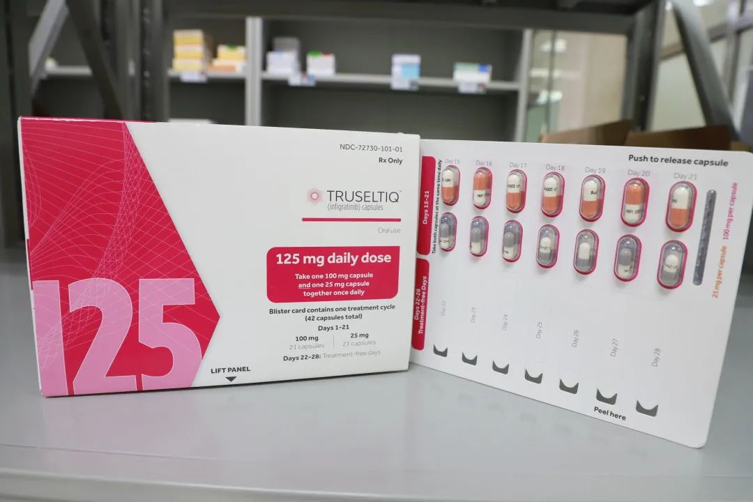 TRUSELTIQ™ (infigratinib) 是一种口服FGFR1-3选择性抑制剂,此前在2021年5月28日美国FDA已加速批准用于既往接受过治疗的、不可切除的局部晚期或转移性胆管癌,且患者需经FDA批准的检测方法确认带有FGFR2融合或FGFR2重排。