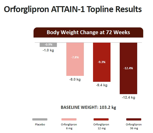 公布营收净利双增的“强劲”二季度业绩的同时,也公布了小分子GLP-1受体激动剂Orforglipron治疗肥胖的三期临床ATTAIN-1顶线数据,数据显示,最高剂量组(36mg)患者72周平均减重12.4%(12.4公斤),显著低于华尔街预期的13%-15%。作为对比,诺和诺德口服司美格鲁肽在同类试验中减重效果达17.4%。