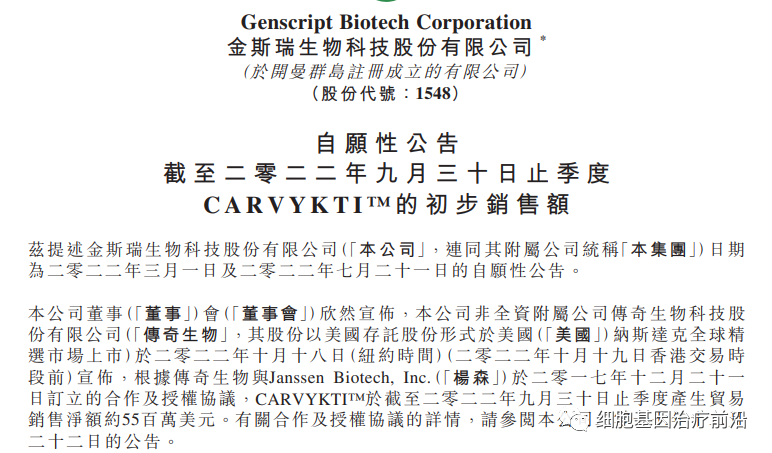 10月19日,金斯瑞生物科技公告,传奇生物的CAR-T疗法产品——西达基奥仑赛(CARVYKTI)今年第三季度销售额5500万美元,约3.97亿人民币(按照近日汇率)。