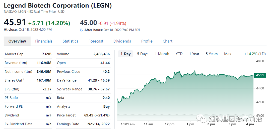 传奇生物在美国上市,目前市值77亿美元,周二股价大涨14%。