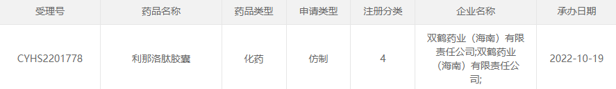 10月19日,华润双鹤全资子公司双鹤药业(海南)有限公司递交了利那洛肽胶囊的上市申请,并获得CDE受理。目前该药国内仅原研获批上市,仿制药方面除此次报产的双鹤药业外,另有四川国为制药于2021年11月递交了上市申请,目前尚在审评审批中。总体来说,该药的国内首仿药竞争程度较弱。