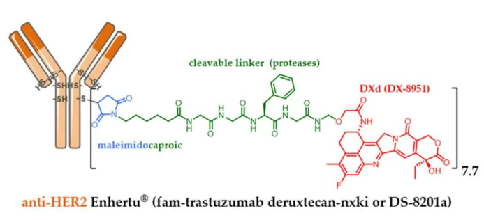 通过对蛋白水解敏感的马来酰亚胺连接体将DXd生物结合到抗HER2曲妥珠单抗半胱氨酸残基上,使得获得均匀DAR为7.7的共轭fam-trastuzumab-deruxtecan nxki(DS-8201a)。尽管DAR很高,但第一三共的DS-8201a在大鼠和猴子中的耐受性非常好,并且在血浆中非常稳定。