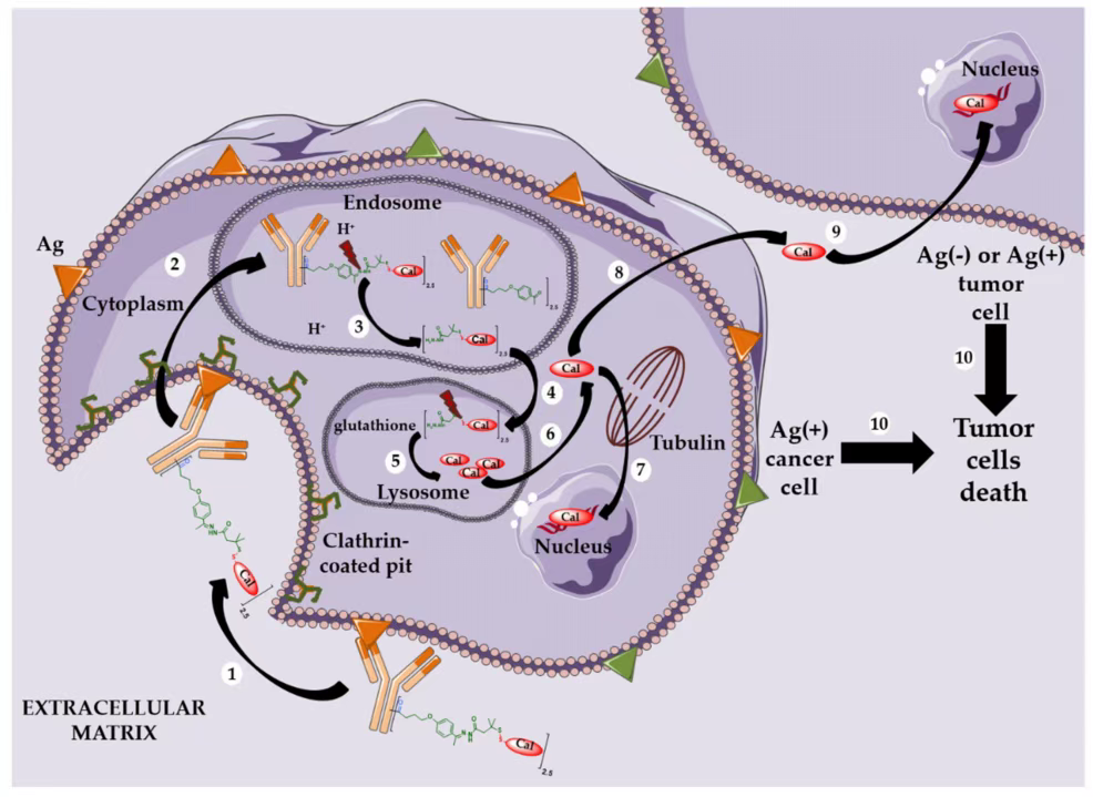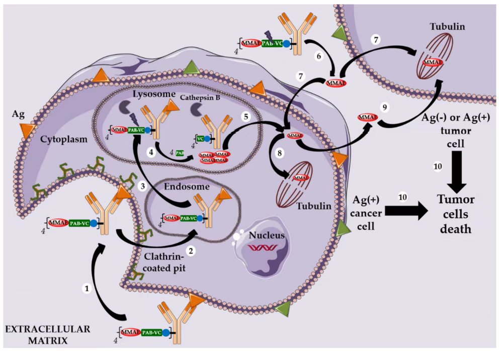 ADCs在肿瘤靶细胞水平上的作用机制包括几个阶段:与抗原结合,内化,药物释放(主要在溶酶体中),药物释放到细胞质中,药物作用于靶标诱导细胞凋亡。这些步骤中的每一步都可能与体外或体内的临床前研究所提示的抗药性有关: