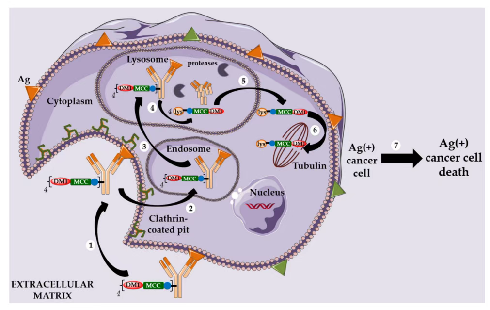 这种新型的ADC在HER2阳性乳腺癌模型中非常有效,只有ADC在内化后在溶酶体中经酶完全消化后,原始结构才具有活性,以获得活性代谢物Lys-MCC-DM1。