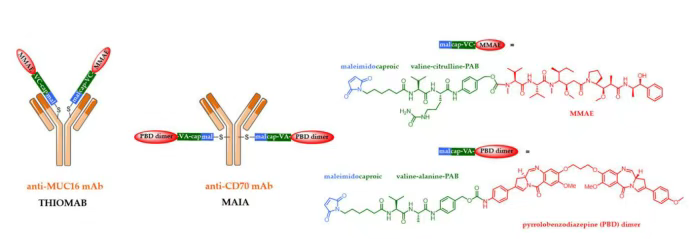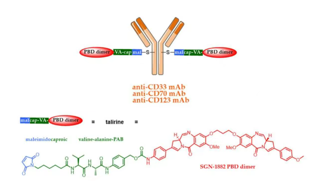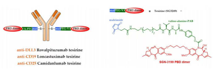 新的细胞毒药物已经被开发出来,以靶向低抗原表达或对auristatins或maytansinoids耐药的癌细胞。为此,人们开发了PBD二聚体,这些二聚体的分子结构包含两个烷基化亚胺官能团,能够与DNA形成共价键。PBD二聚体比传统细胞毒性药物(MMAE或DM1)的效力高约50-100倍。Spirogen和Seattle Genetics将PBD二聚体作为ADC细胞毒性物质引入,并开发了SGN-CD33A(vadastuximab-Talinine)和SGN-CD70A,然而很不幸,这两种基于PBD的ADC最近在III期临床试验中被迫停止。SGN-CD33A与致命感染和可能的肝毒性导致的较高的患者死亡率相关,而SGN-CD70A与血小板减少有关。