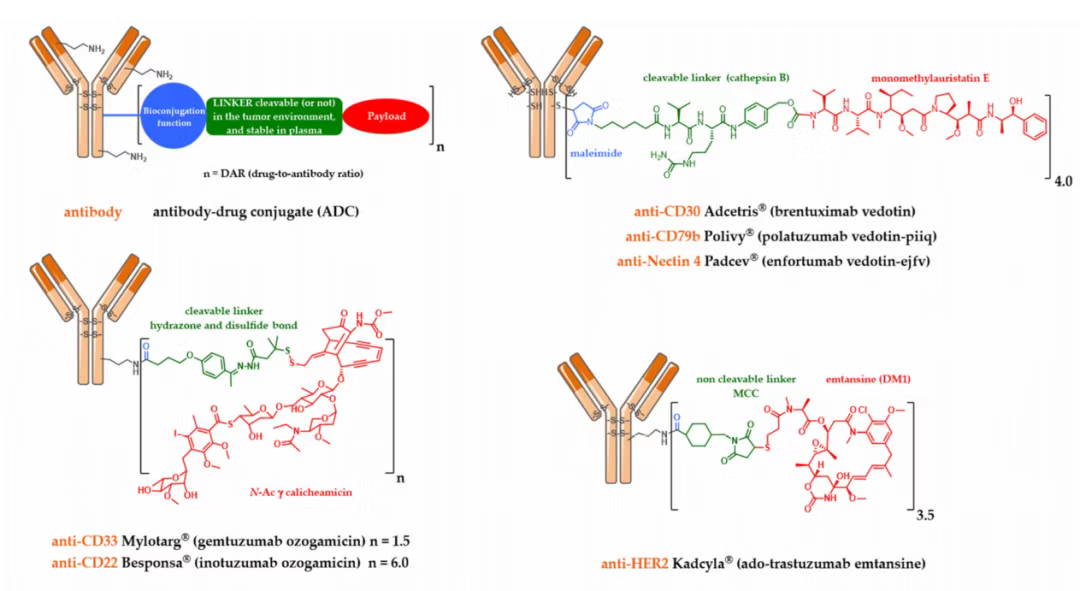 与此同时,西雅图遗传学设计了自己的偶联技术,通过可切割连接子mc-VC-PABC,其中包含马来酰亚胺基间隔子、作为组织蛋白酶底物的标准Val Cit二肽序列和PABC自降解间隔子,将金盏花素(MMAE)生物偶联到抗CD30 抗体的半胱氨酸残基上,这种ADC(Adcetris)于 2011年被FDA批准用于间变性大细胞淋巴瘤和霍奇金淋巴瘤的治疗。