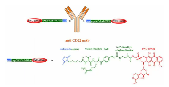 Genentech开发了一种新的抗CD22-NMS249 ADC,新的蒽环类化合物命名为PNU-159682。蒽环类药物是目前应用最广泛的化疗药物之一,在治疗侵袭性非霍奇金淋巴瘤(NHL)方面非常有效。该ADC使用MC-VC-PAB-DEA接头,带有一个加长的自锁间隔区,除了传统的PAB外,还包括N,N′-二甲基乙二胺(DEA)。在体内,这种抗CD22-NMS249 ADC在异种移植瘤模型中与抗CD22-VC-MMAE ADC一样有效,而在基于抗CD22-VC-MMAE ADC的细胞系的模型中仍然有效。证明了蒽环类ADC在治疗MMAE耐药癌症中的有效性。