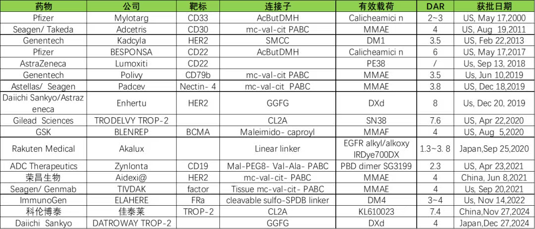2009年gemtuzumab ozogamicin(Mylotarg) 是美国食品和药物管理局(FDA)批准的第一个ADC药物。目前,FDA已经批准上市了17个ADC药物,还有上百个ADC药物正处于临床研究阶段。
