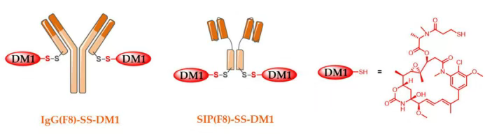 纤维连接蛋白是肿瘤内皮下细胞外基质的一种成分,与癌细胞表面相比,更容易获得免疫结合。SIP形式是单链抗体片段与人IgEεCH4结构域融合的结果。SIP(F8)在C-末端位置用两个未成对的半胱氨酸残基生成,允许两个DM1分子进行区域特异性生物偶联,以产生SIP(F8)-SS-DM1的DAR=2的偶联物。