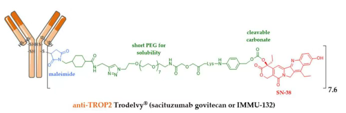 在许多开发ADC的公司中,Immunomedics设计了一个令人惊讶的ADC,通过三重赌注:构建一个针对稍微过表达靶点的ADC,使用了一个混合了细胞内和细胞外释放的系统,以及比常规使用的有效载荷更弱的毒性药物。Sacituzumab-govitecan(IMMU-132)是一种抗TROP-2单抗,通过具有短聚乙二醇化单元的可裂解马来酰亚胺连接体与SN-38(伊立替康的活性代谢物)偶联。