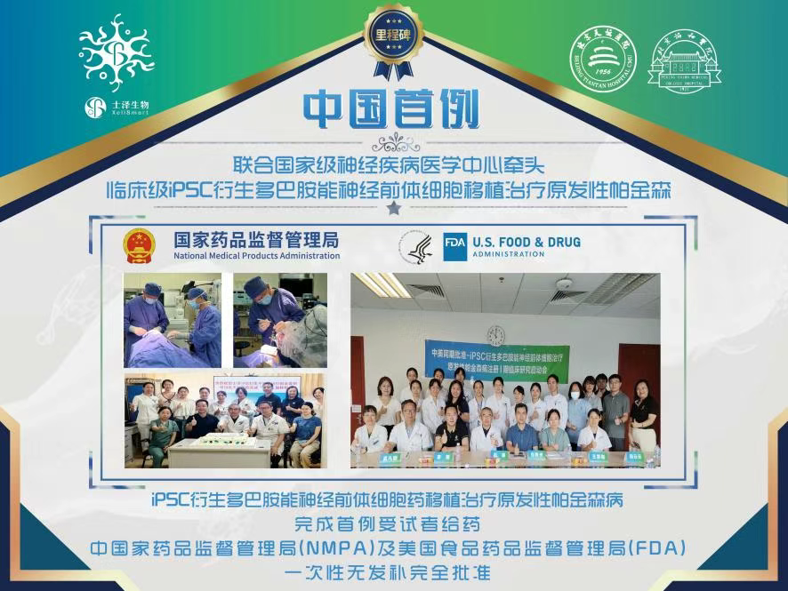 2025年8月,“中国首个”由国家级神经疾病医学中心(首都医科大学附属北京天坛医院)牵头、联合北京协和医院开展的“临床级iPSC衍生多巴胺能神经前体细胞治疗原发性帕金森病”注册临床试验完成全国首例中重度原发性帕金森病患者入组。