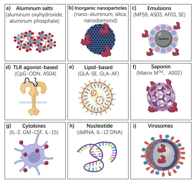 佐剂在各种疫苗中已有广泛的应用。包括全病毒疫苗(如减毒活疫苗、灭活疫苗和病毒载体疫苗)、亚单位疫苗和核酸疫苗(包括DNA和mRNA)。